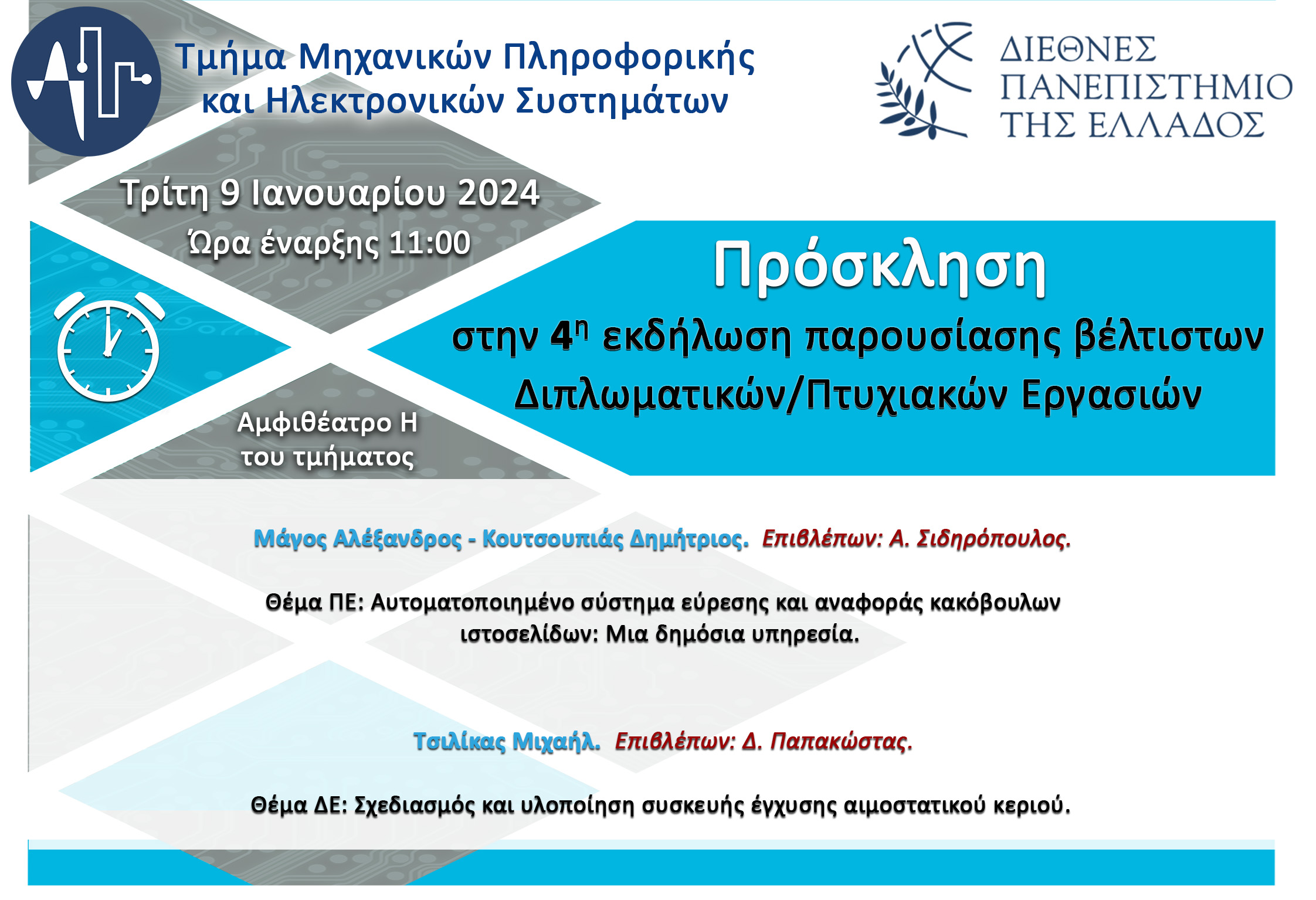 Οι βέλτιστες Διπλωματικές/Πτυχιακές Εργασίες του 2023, θα παρουσιαστούν από τους φοιτητές που έχουν επιλεγεί από την Επιτροπή αξιολόγησης του τμήματος, την Τρίτη 9 Ιανουαρίου 2024 με ώρα έναρξης 11:00, στο αμφιθέατρο Η.