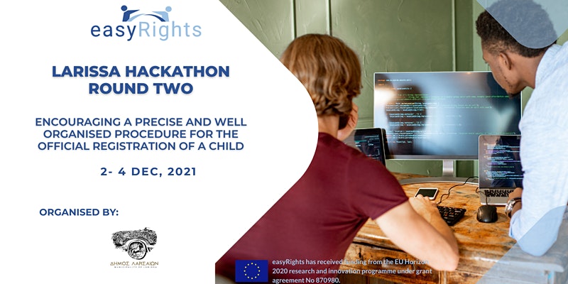 Ο Δήμος Λαρισαίων, ως εταίρος του Ευρωπαϊκού έργου “easyRights – Enabling immigrants to easily know and exercise their rights”, διοργανώνει το online event / Hackathon round II με τίτλο “ Ενισχύοντας και βελτιώνοντας την διαδικασία έκδοσης του πιστοποιητικού γέννησης για μετανάστες / πρόσφυγες” το οποίο θα λάβει χώρα στις 2, 3 και 4 Δεκεμβρίου 2021.