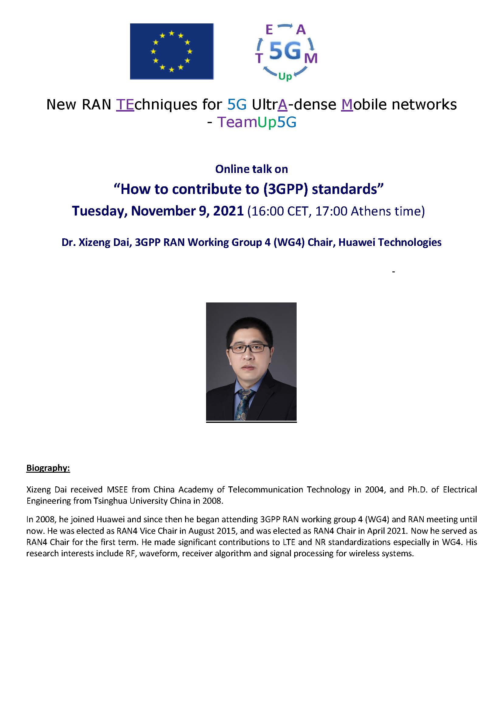 Online talk on “How to contribute to (3GPP) standards” by Dr. Xizeng Dai, 3GPP RAN Working Group 4 (WG4) Chair, Huawei Technologies