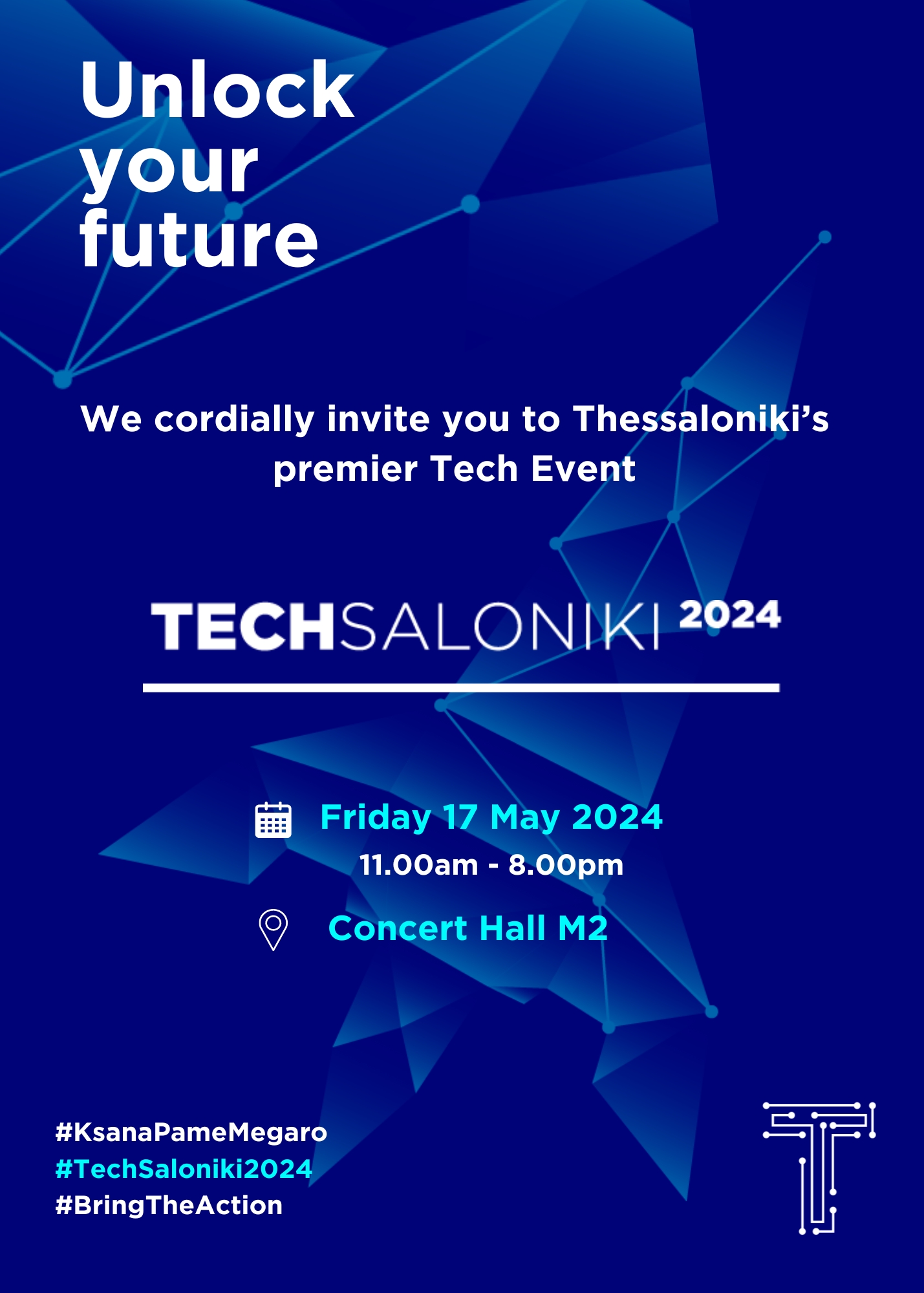 Για 8η συνεχόμενη χρονιά το TechSaloniki 2024, η ετήσια συνάντηση θεσμός του κλάδου της τεχνολογίας επιστρέφει στις 17 & 18 Μαΐου 2024 στο κτήριο Μ2, στο Μέγαρο Μουσικής Θεσσαλονίκης. Η εκδήλωση τελεί υπό την αιγίδα του Υπουργείου Ψηφιακής Διακυβέρνησης, της Περιφέρειας Κεντρικής Μακεδονίας και του Δήμου Θεσσαλονίκης.